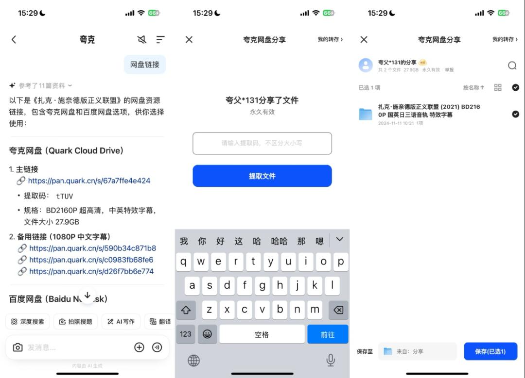 我也给大家试了,扎导版的《正义联盟》、《星际穿越》啥的高清片源,也是对话框一问就直接告诉你链接,点一下直接存网盘。