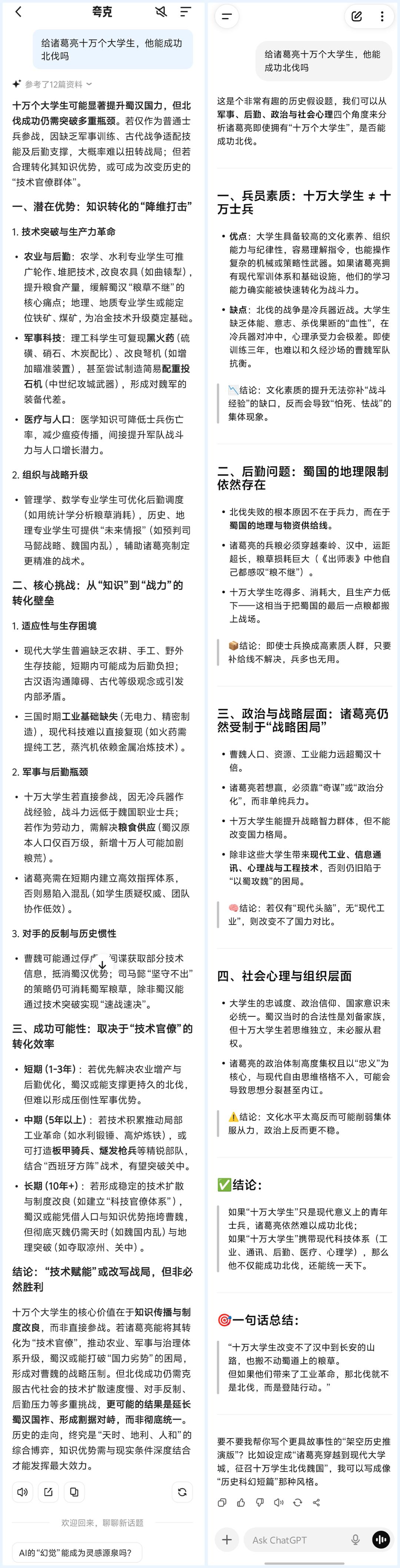 同一个问题,我分别丢给夸克、ChatGPT和其他的国内AI模型,答案我只能说画风突变,简直是F人跟T人的交流现场。