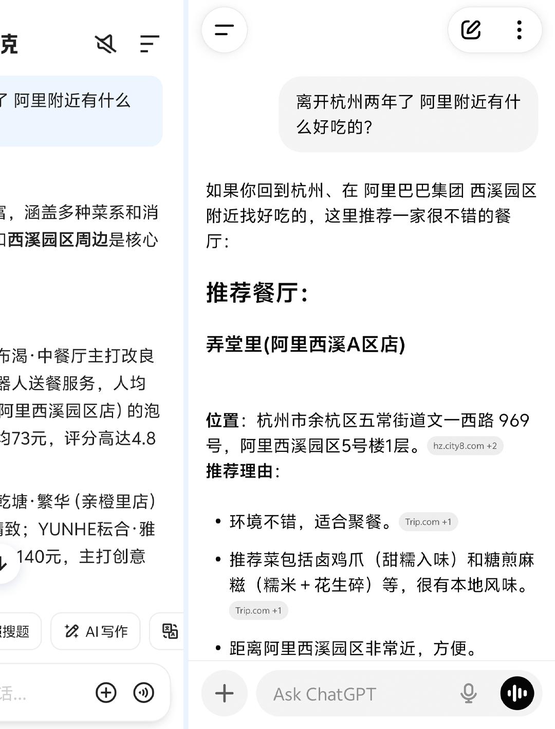 比如你要是问,“离开杭州两年,阿里附近有什么好吃的?”