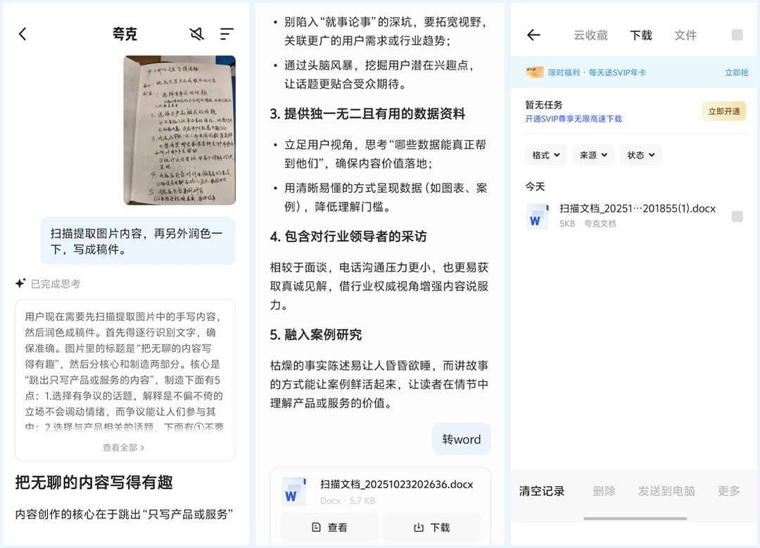 这还没完,点一下下载,文件直接就存进了夸克网盘,还能多端同步。都不用打开电脑改格式,直接就能发给别人了。