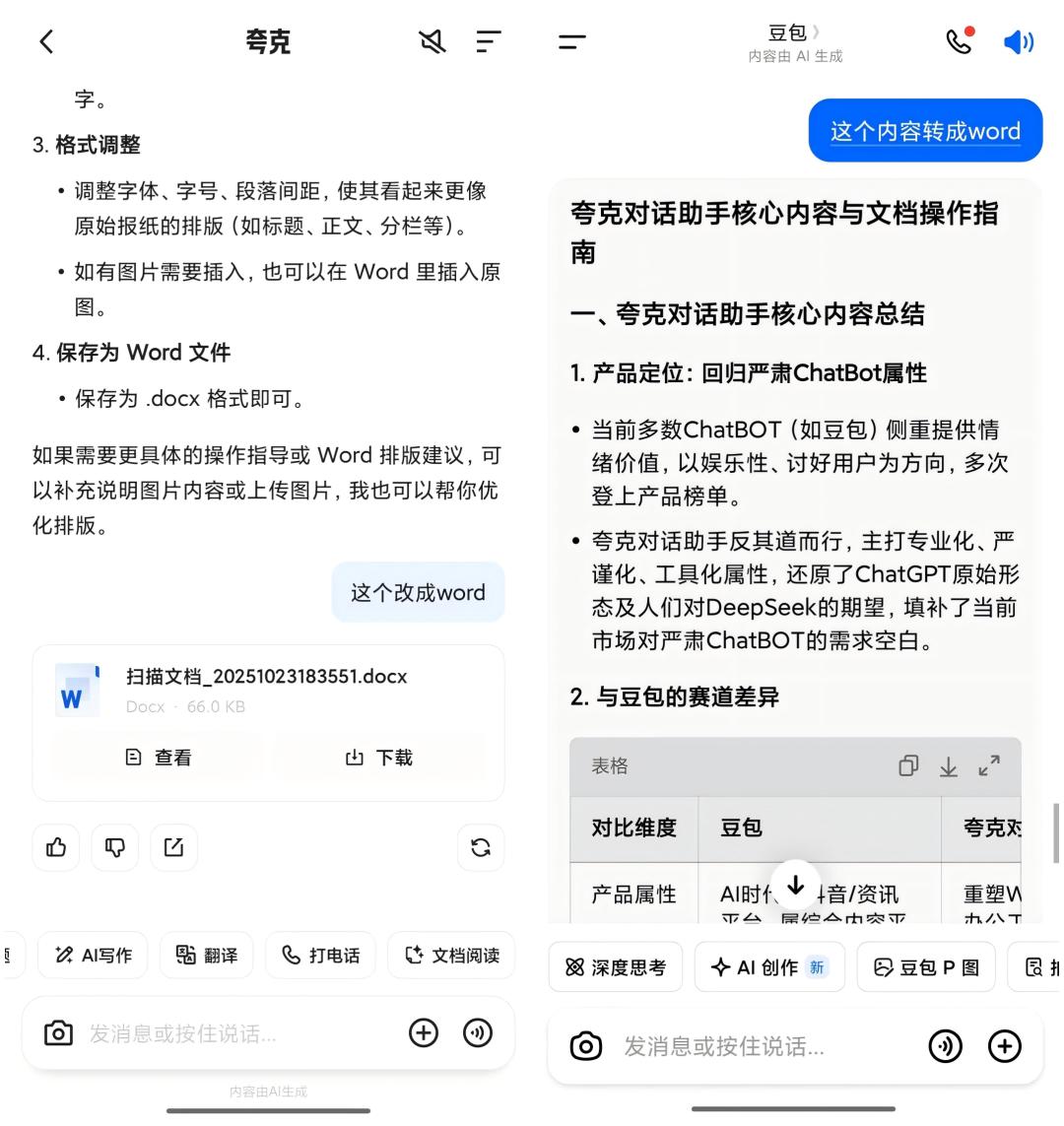 图注:夸克可以把对话内容随意转化成文档,豆包似乎有些难以理解。