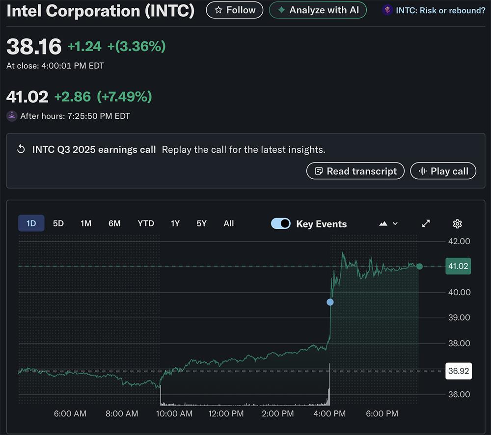 因营收、毛利率、每股收益均高于预期,英特尔在盘后交易中股价上涨逾7%。