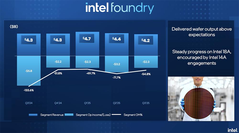 因芯片代工效率提高,英特尔制造业务的业绩有所改善。第三季度,英特尔芯片代工业务收入同比下降2%,至42亿美元;净亏损为23亿美元,较去年同期的58亿美元显著改善。