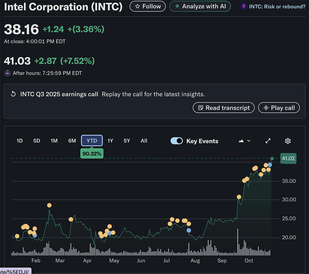 今年迄今,该公司股价已上涨约90%。其中大部分涨幅来自近两个月,美国政府、软银、英伟达相继宣布入股英特尔,英伟达还与英特尔宣布芯片业务合作,这些变化增强了人们对英特尔未来的信心。