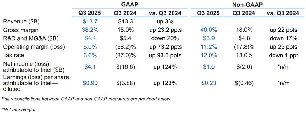 英特尔第三季度营收为137亿美元,同比增长3%,净利润实现扭亏为盈。得益于回归内部制造,英特尔本季度毛利率升至40%。