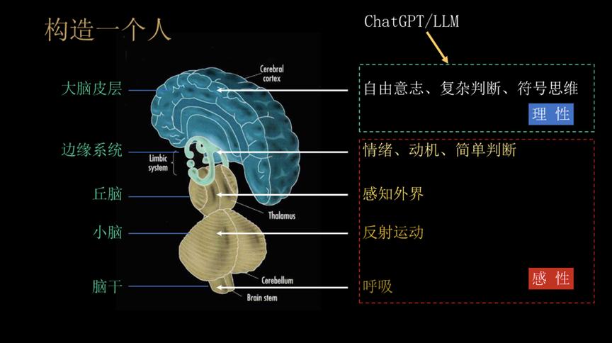 在人的大脑里,最底层的脑干是呼吸的中枢,往上面走是小脑,他是让我们能够行走的一部分;再往上面走是丘脑,它能够感知外界;再往上面走是边缘系统,它能产生情绪、情感,作出一些简单的判断。