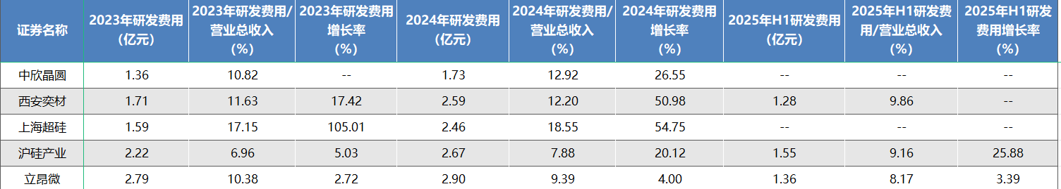 在研发投入上,中欣晶圆2023年与2024年分别为1.36亿元与1.73亿元,低于沪硅产业等企业,在研发费用对营业收入的占比上则大体相当。研发费用增长率26.55%,大致处于中游。