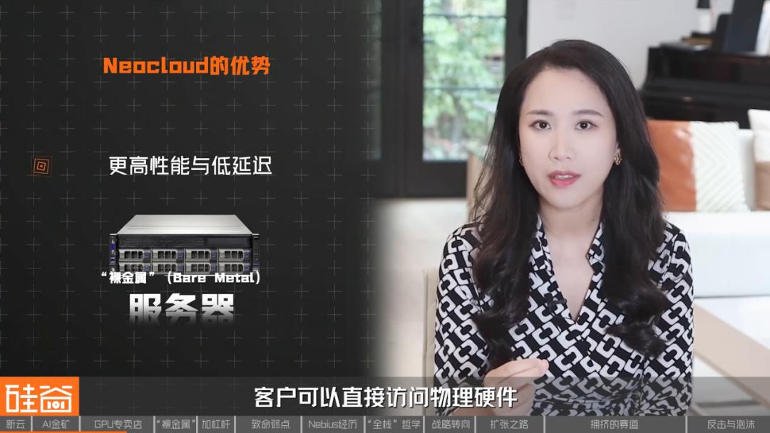 第一是更高性能与低延迟:Neocloud抛弃了传统云厂商中,为了实现多租户隔离而引入的虚拟化层(hypervisor),直接向客户提供所谓的“裸金属”(Bare Metal)服务器。客户可以直接访问物理硬件,减少了软件开销,从而获得更低的延迟和更高的性能。这对于需要进行大规模、紧密耦合计算的AI模型训练来说至关重要。