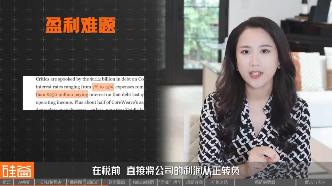 第一是盈利难题:在高速增长的光环下,市场的关注点正悄然从单纯的收入增长,转向对其盈利能力的审视。在最近的财报中,尽管CoreWeave的营收大幅超出预期,但其每股收益(EPS)却不及预期。高昂的债务带来了沉重的利息负担,利率在7%到15%之间,单季度的利息支出就超过2.6亿美元。这笔巨款,在税前,直接将公司的利润从正转负。有分析师甚至直言不讳地说:“这就是一个破坏价值的实体。”