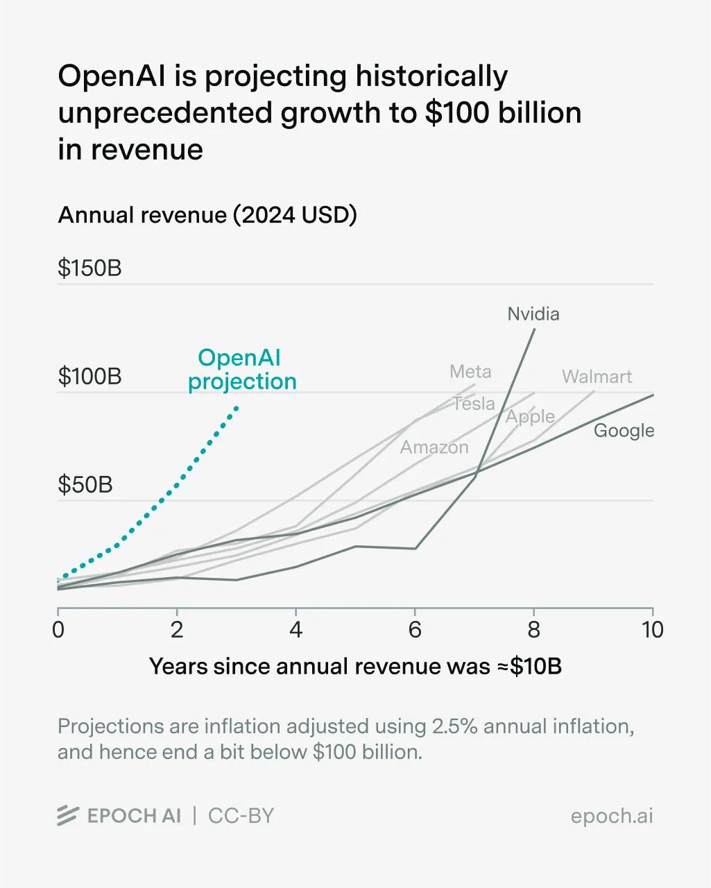 如此惊人的增速在科技史上前所未见,即便是谷歌、Meta这类巨头,当年也用了近十年时间才从十亿级收入增长到千亿规模。