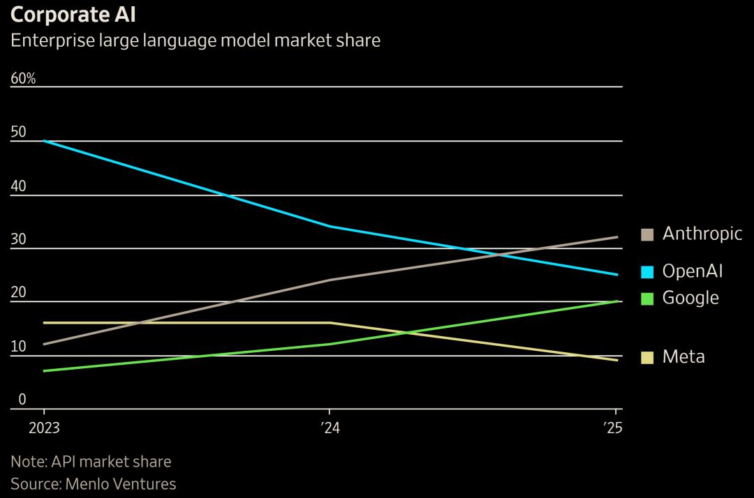 AI市场B端用户市场份额分布,Anthropic为32%,而OpenAI为25%