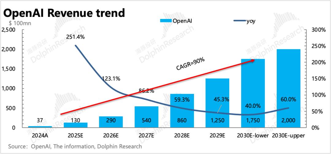 面对承付能力质疑,OpenAI的商业化展望是这样的:2025年预计营收130亿(隐含下半年收入87亿,环比100%增长),2029年目标1250亿,2030年目标1740-2000亿,未来5年CAGR超过90%。