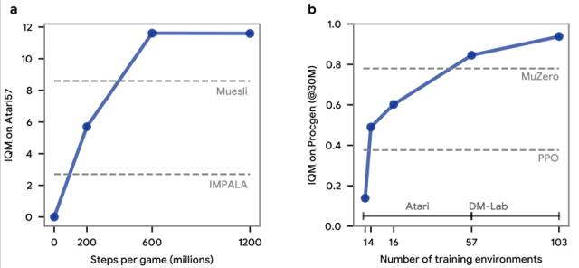 评估时使用与 MuZero 相当规模的网络架构,结果显示,Disco57 的 IQM 达到 13.86,在 Atari 基准上超越了包括 MuZero、Dreamer 在内的所有现有强化学习规则,并且在实际运行效率(wall-clock efficiency)上显著优于最先进的 MuZero。
