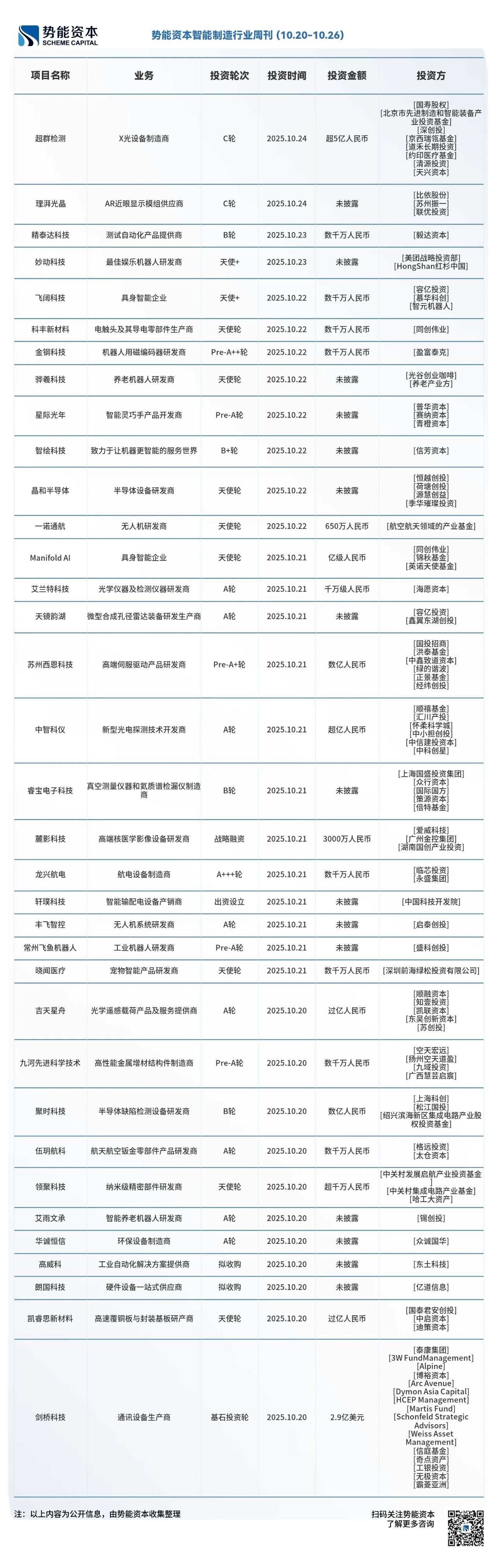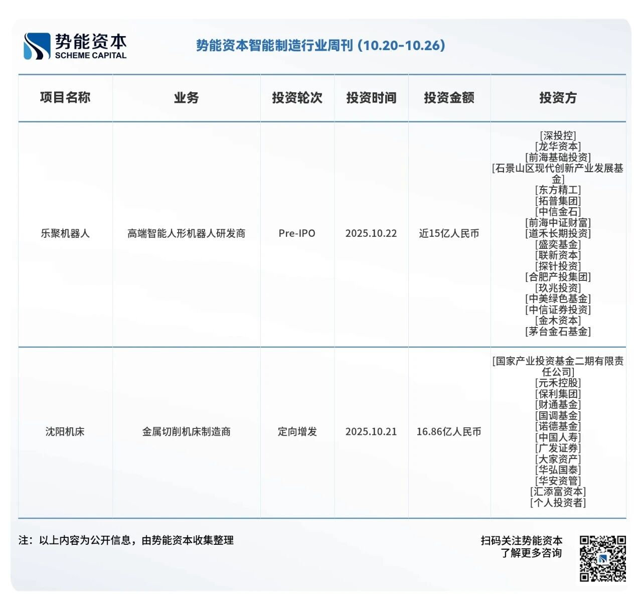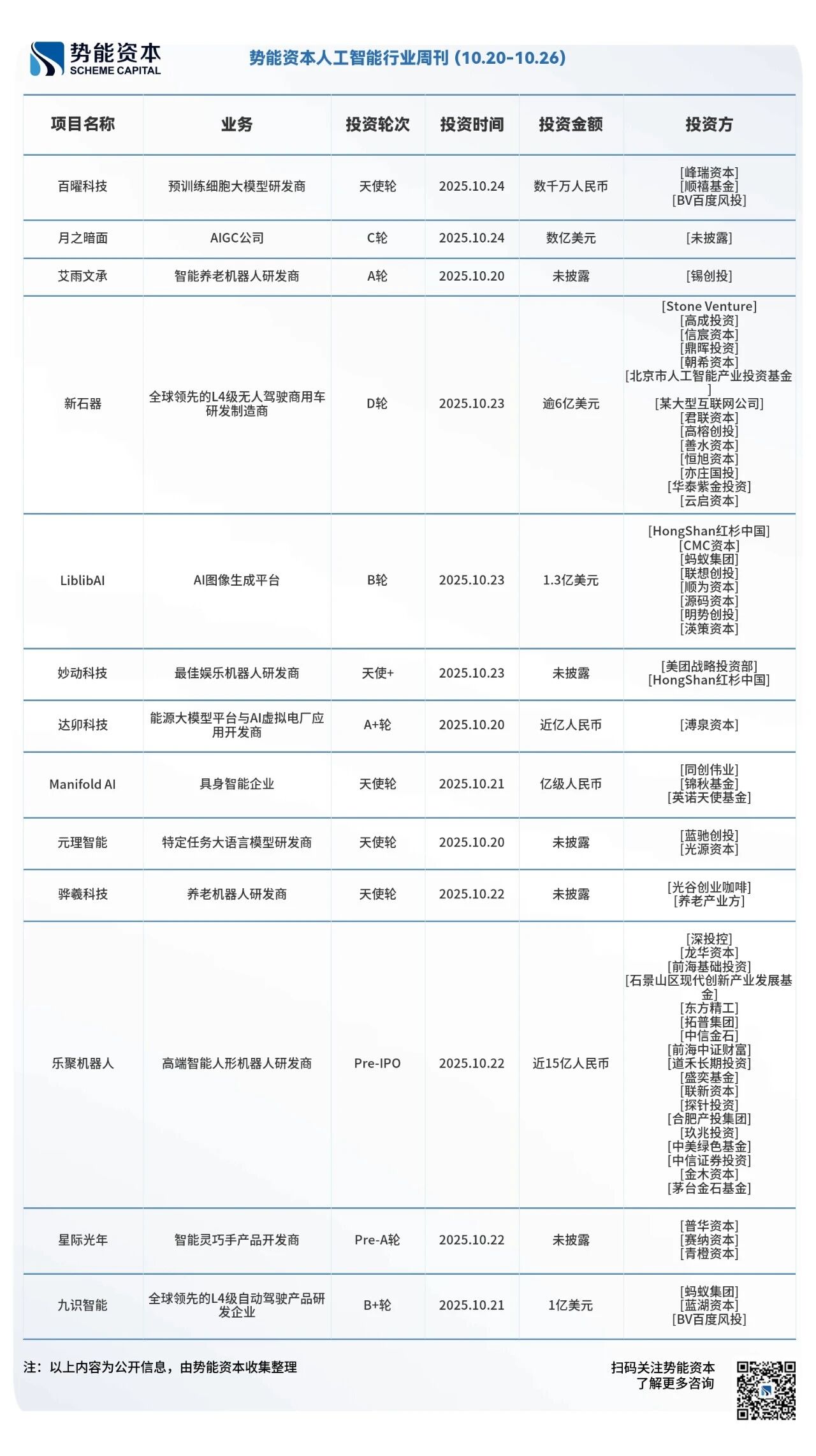 本周LiblibAI1.3亿美元的B轮融资, 由红杉中国、CMC 资本及一战略投资方联合领投,老股东顺为资本、源码资本、明势创投、渶策资本也进行了超额增持,成为国内最大单笔 AI 应用投资。Manifold AI完成亿级人民币的天使轮融资,投资方为同创伟业,锦秋基金,英诺天使基金。乐聚机器人完成近15亿人民币的Pre-IPO轮。