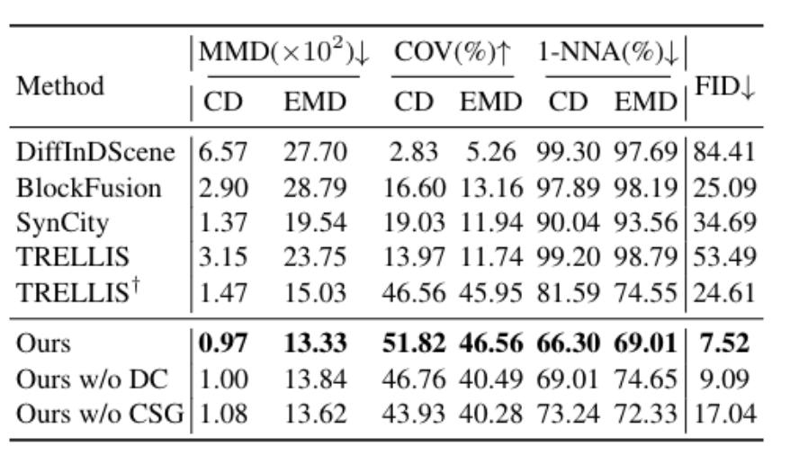 实验数据显示,在3D-FRONT数据集上,它的几何重建指标MMD、COV均达SOTA,FID(用于评估生成质量的核心指标,越低越优)低至7.52,大幅优于SynCity、BlockFusion等主流方法;