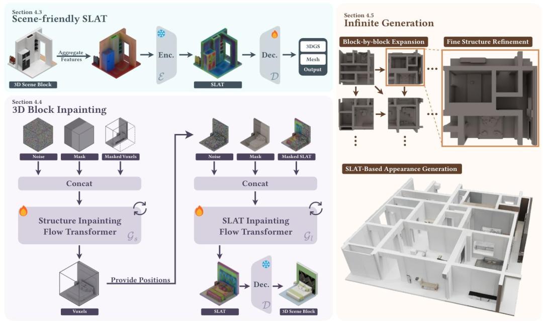 第二步靠3D块补全机制实现了无缝拼接,在生成新区块时,先让结构生成器确定3D结构框架,再让latent生成器重建结构化潜变量(SLAT)特征,保证外观风格统一。