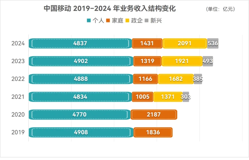 在新兴市场也就是在N端,中国移动同样在2021年年报中开始进行数据披露,是年收入为303亿元,收入占比为3.57%;到了2024年,新兴业务收入为536亿元,收入占比增长至5.15%。