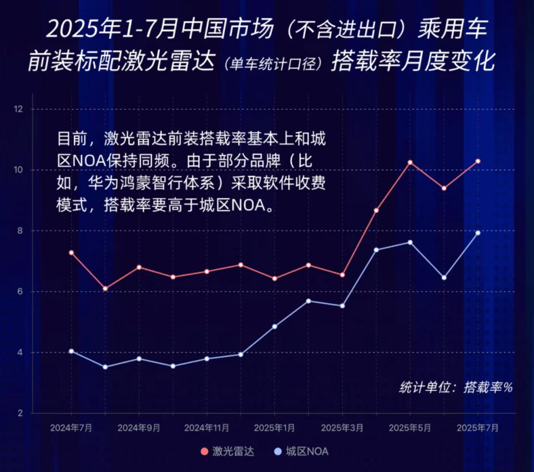 据高工智能汽车数据显示,2025 年 1–7 月,中国市场(不含进出口)标配激光雷达的新车累计交付 104.84 万辆,同比增长 69.73%。其中,20–30 万元区间车型的标配率一度接近 30%。