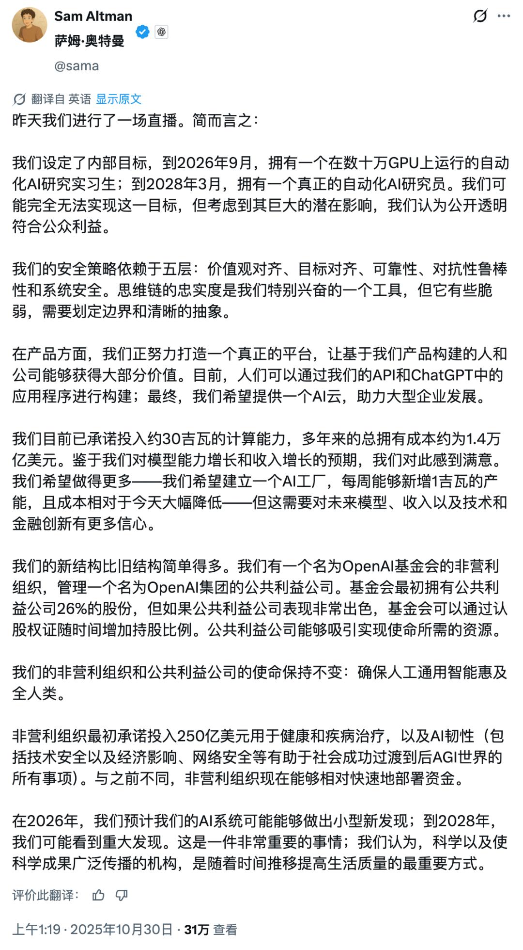 非营利机构(现在叫 OpenAI 基金会)依然掌控营利性实体 OpenAI Group PBC(公益公司)。基金会所持股权估值约 1300 亿美元,这让它直接成为史上资源最雄厚的慈善机构之一……