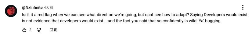 不过需要提醒的是:a16z 本质上是一家投资公司,其表述更多代表资本方视角。当人类创造力被直接折算为宏观 GDP 的财务口径时,难免引发质疑与反讽。对此,有网友评论道:“开场就把行业从业者简化成金钱价值,再把几家初创的产出与整个人群的经济贡献划等号,最后还拿全球第七 / 第八大国的 GDP 来背书——全程一脸得意,主持人也在旁边笑……”另有网友指出,这种乐观态度忽视了关键问题:“无奈坐视时代变迁,却不知道该如何适应,这不正是最大的危机吗?嘴上说着开发者不必担心生存,却拿不出什么真凭实据…还一副言之凿凿的样子,真的无语。”