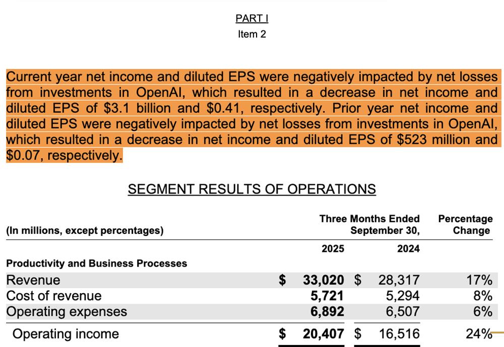 本年度净利润和摊薄后每股收益受对OpenAI投资净亏损的负面影响,分别导致净利润和摊薄后每股收益减少31亿美元和0.41美元。上年度净利润和摊薄后每股收益也受对OpenAI投资净亏损的负面影响,分别导致净利润和摊薄后每股收益减少5.23亿美元和0.07美元。