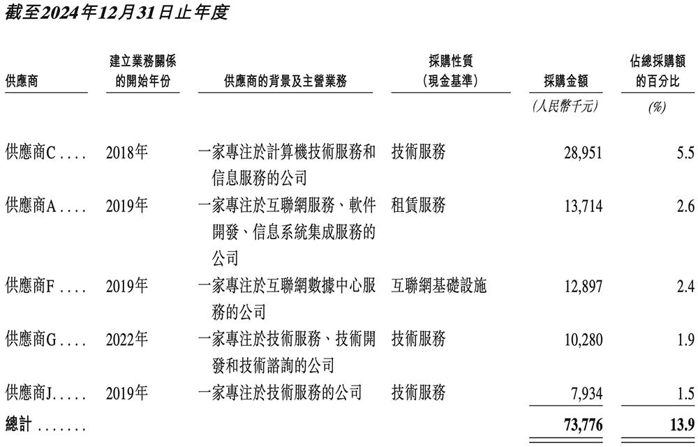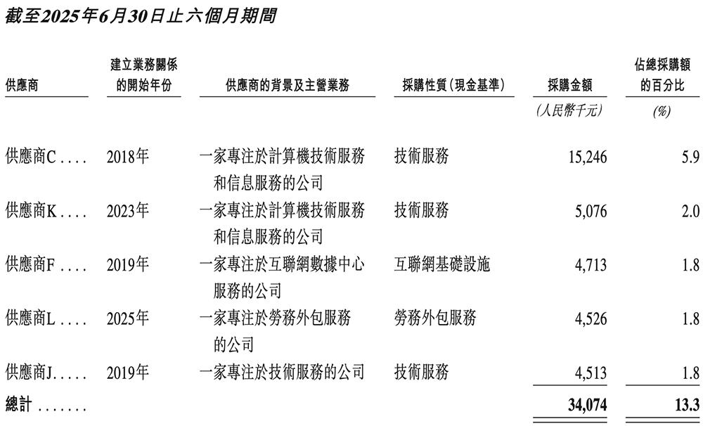2022年、2023年、2024年、2025年1-6月,向五大供应商的采购额分别占明略科技同期采购总额约20.5%、15.6%、13.9%、13.3%。