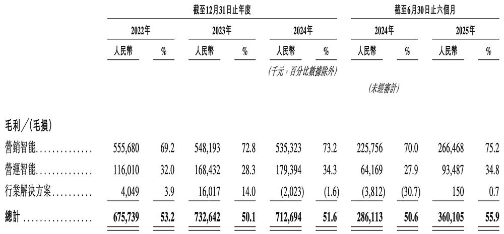 其产品和解决方案分为三类:营销智能、营运智能、行业解决方案。其中营销智能在过去三年半贡献了超过50%的收入占比。