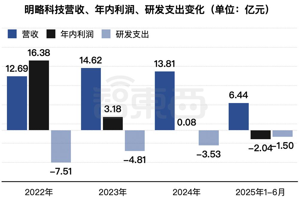 2022年、2023年、2024年、2025年1-6月,明略科技收入分别为12.69亿元、14.62亿元、13.81亿元、6.44亿元,净利润分别为16.38亿元、3.18亿元、0.08亿元、-2.04亿元,研发费用分别为7.51亿元、4.81亿元、3.53亿元、1.50亿元。