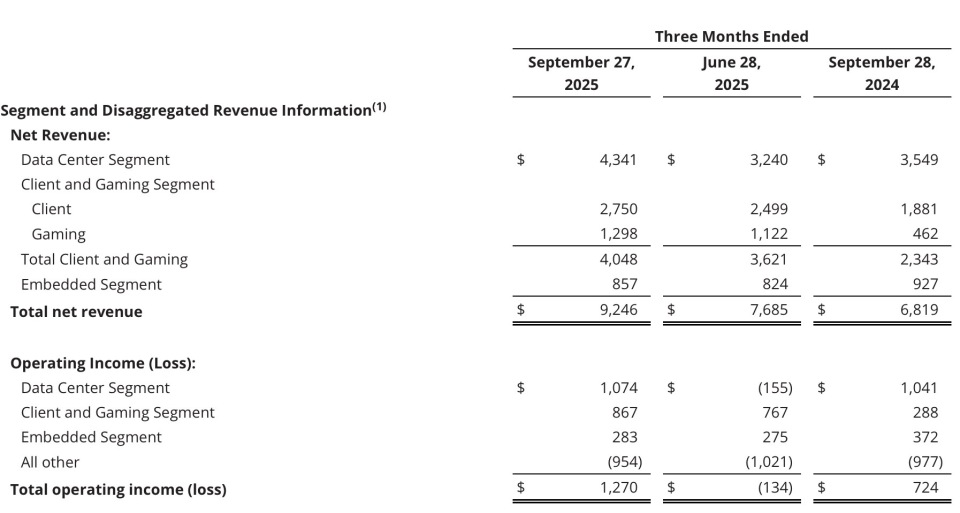 按照部门划分,AMD第三财季营收和运营利润情况如下:
