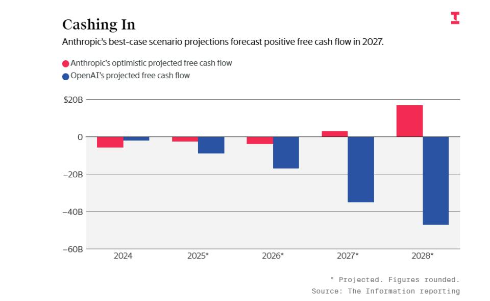 更值得关注的是,这家推出Claude聊天机器人仅四年的AI新锐,预计最快将于2027年实现正向现金流。这一时间表明显快于其竞争对手OpenAI,后者预计要到2030年才能实现这一目标。