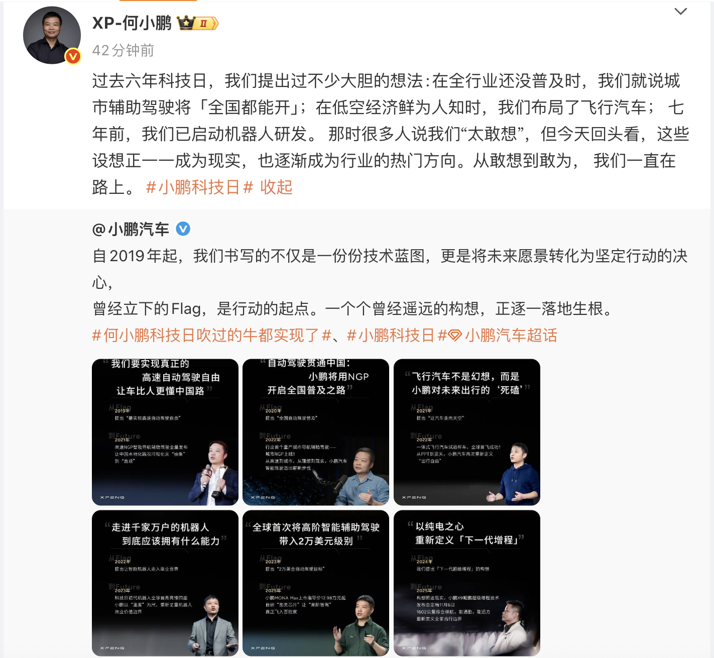 凤凰网科技讯 11月5日,小鹏汽车董事长何小鹏发文称,过去六年科技日,我们提出过不少大胆的想法:在全行业还没普及时,我们就说城市辅助驾驶将“全国都能开”;在低空经济鲜为人知时,我们布局了飞行汽车;七年前,我们已启动机器人研发。那时很多人说我们“太敢想”,但今天回头看,这些设想正一一成为现实,也逐渐成为行业的热门方向。从敢想到敢为,我们一直在路上。