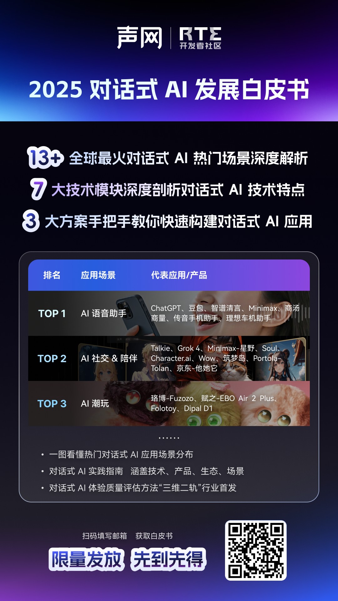 而为帮助企业和开发者把握对话式AI这一历史机遇,声网在大会上正式发布了《2025对话式AI发展白皮书》。在这份白皮书里,声网团队经过行业调研,深入结合了其在RTE行业的经验,为对话式AI梳理了一份完整的图谱——包括技术演进、核心技术、主流方案和业态、质量评估体系、行业实践案例、以及未来趋势展望。