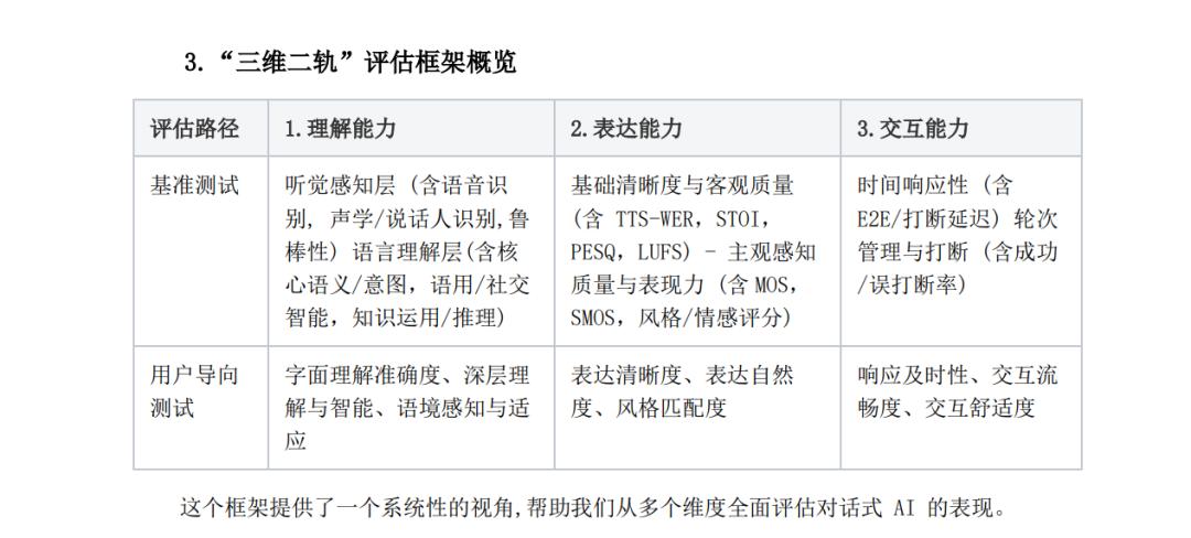 为此,在声网发布的《2025对话式AI发展白皮书》中,便提出了“三维二轨”的评估框架——“三维”,考核的是AI本身的能力,比如理解能力、表达能力、交互能力;“二轨”,则是考核AI的两种方法,包括基准测试和用户导向测试。
