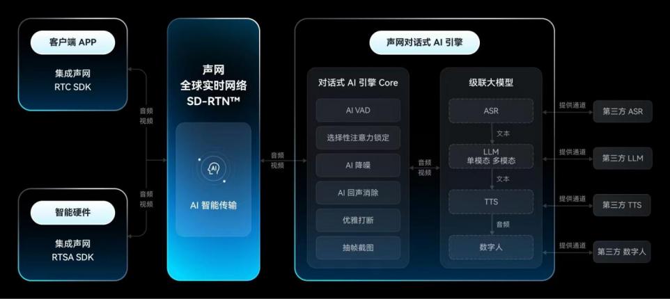 具体而言,引擎2.0依托于全球实时网络,能够实现端到端高速响应,实现超低延迟。另外,还内置了智能打断、声纹识别等先进功能,使得对话能够实现智能交互。此外,引擎2.0还是开发者友好型设计,支持多种主流大模型,不同的模块功能也可以按需选用,能快速集成到不同的应用场景中。