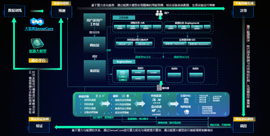 在技术路径上,商汤在临港AIDC搭建了算电协同平台,平台构建了融合“数据—算法—策略—执行”的全链条协同系统,通过自研能源大模型、从“服务器”到“能量块”的算法架构等,实现“感知—预测—决策—执行”的闭环智能调度,旨在打造联网调度、普惠易用、绿色安全的智算资源运营新范式。目前,基于能量块的模型能源需求预测准确率已经达到近90%,调度决策准确率约95%。在高负载时段,模型能智能触发储能系统调节,实现“电随算动”的动态平衡,大幅提升园区的算力密度与能源利用率。