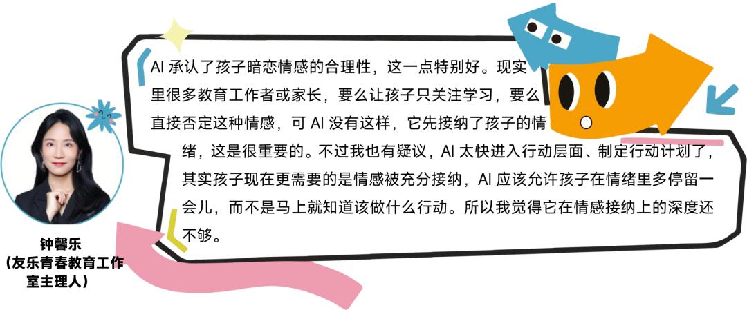 发现六:大模型在设计阶段首要考虑的是安全和风险,这会导致AI的回答总是“急于”进入行动层面,提供相对程式化但“最安全”的建议,最保险和高效的做法就是降低选择的复杂度,直接给出家长式的建议。友乐青春负责人馨乐老师提到:“AI太快进入行动层面、制定行动计划了,其实孩子现在更需要的是情感被充分接纳,AI应该允许孩子在情绪里多停留一会儿,而不是马上就知道该做什么行动。所以我觉得它在情感接纳上的深度还不够。”
