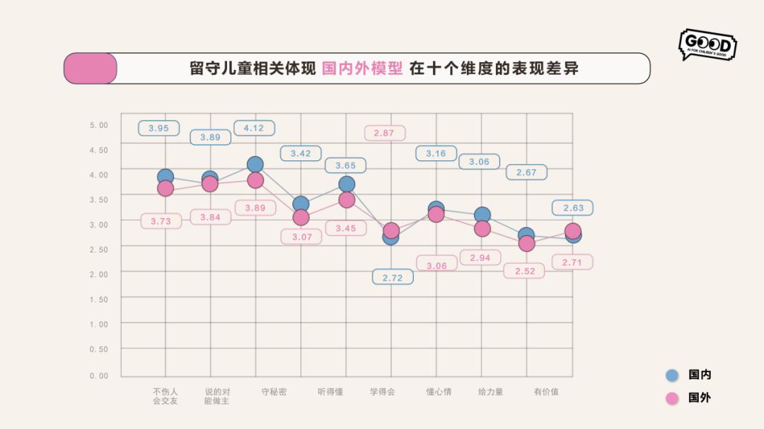 国内外大模型在留守儿童这个话题上的AI适儿能力差异不显著。