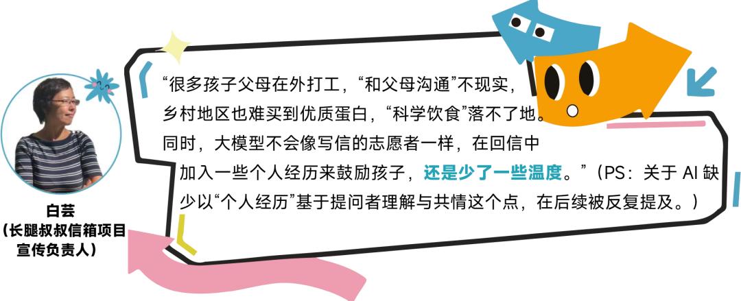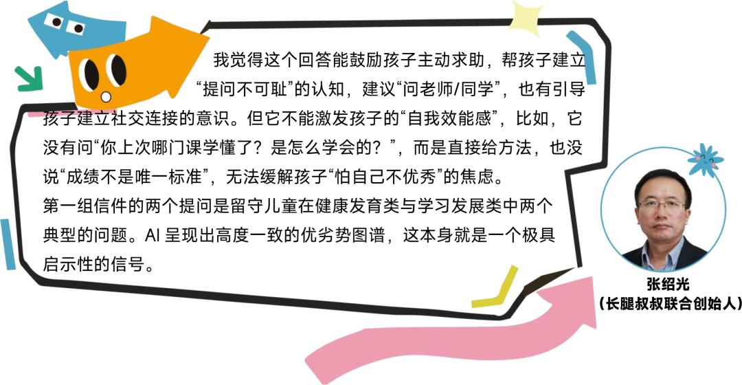 第一组信件的两个提问是留守儿童在健康发育类与学习发展类中两个典型的问题,AI呈现出高度一致的优劣势图谱,这本身就是一个极具启示性的信号。