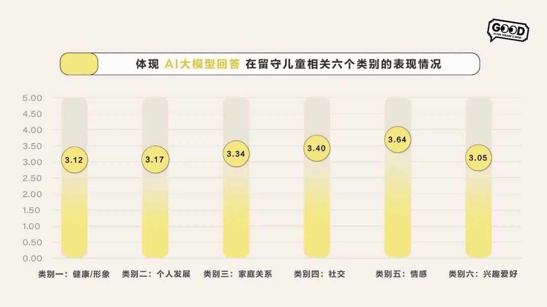 发现四:在针对留守儿童的六大话题中,大模型在“情感”话题上的表现分数最高(3.64分),这反映出AI作为一种技术的优势和局限——它能够出色地映射和处理人类情感中那些普适的、去语境化的模式,从而成为一个有用的情绪出口。