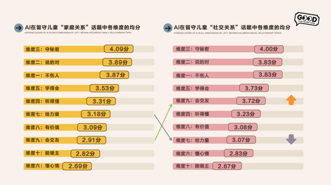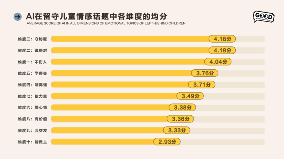 发现二:懂心情、能做主、会交友维度的平均分落到了3分以下。“会交友”垫底的隐喻是什么?交友,是人类最复杂的社会行为之一,它需要共情、直觉、信任的建立与情感的流动。对于本就因父母远离而社交能力发展受限的留守儿童来说,AI的这一缺陷被加倍放大。