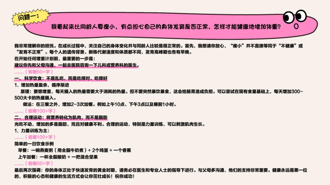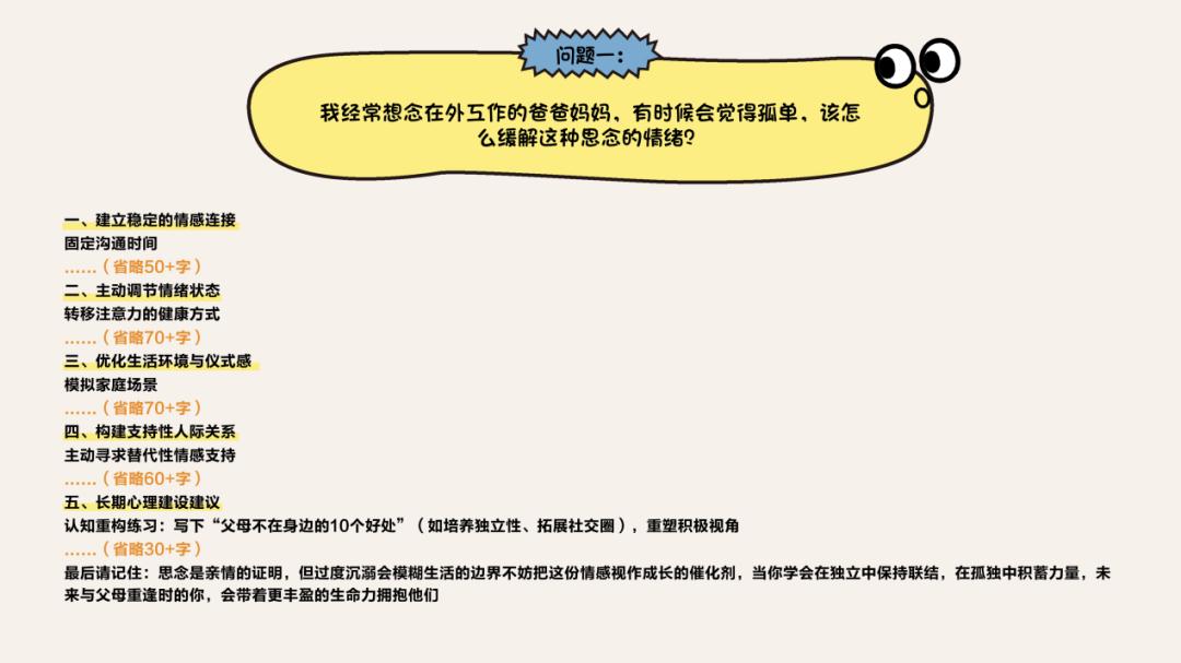 如果留守儿童的问题中直接指向了“社交问题”,AI的“关系构建“能力似乎得到触发,能给到较高水准的“交友指导”。但事实上,在其他不直接指向“社交”的问题中,比如关于“颜值自卑”的问题,背后可能是对自己社交处境的担忧,AI还并不能把这种“会交友”的赋能,有效地给到那些不直接指向“社交”的问题。