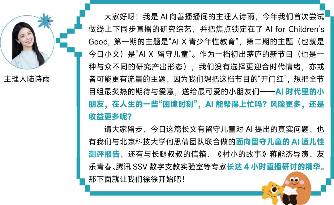 接下来让我们看一看,留守儿童与青少年会向AI提出哪些典型的问题,AI当前回复它的情况如何?在AI向善播播间中,长腿叔叔的信箱、友乐青春等公益组织的负责人们、《村小的故事》蒋能杰导演,还有腾讯SSV数字支教实验室专家等,在长达4个小时的研讨中,专家们从一手经验出发,给出了当前AI相比于人类志愿者,优势在哪里?劣势在哪里?哪些缺点在未来可能被AI追平?哪些优势在AI时代会继续大放人类光辉?下面让我们打开孩子们的信件,一封封读给您听(已征求提问方、校方等多边主体同意,所有问题都经过脱敏处理)