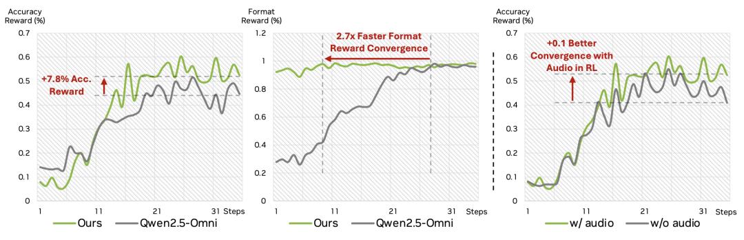 不单只SFT,在后训练阶段加入音频模态也能进一步增强GRPO的效果: