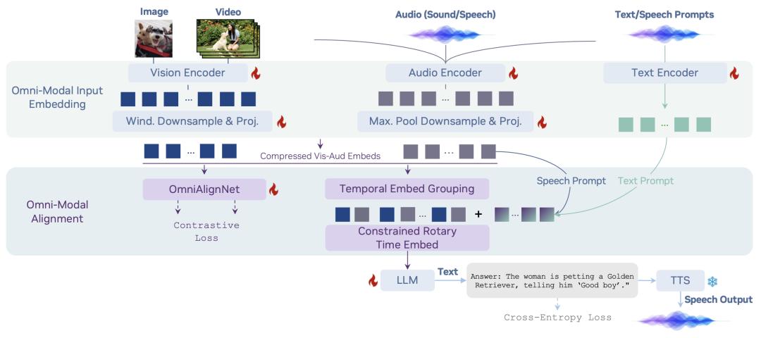- 核心技术革新: 它通过名为全对齐网络(OmniAlignNet )的创新架构,以及时序嵌入分组(Temporal Embedding Grouping)和约束旋转时间编码(Constratined Rotary Time Embed)等技术,实现了视觉和听觉信号在时序上的高精度对齐。简单来说,它不仅「看懂」了视频,「听懂」了声音,更能精准理解「什么声音在什么画面发生」。