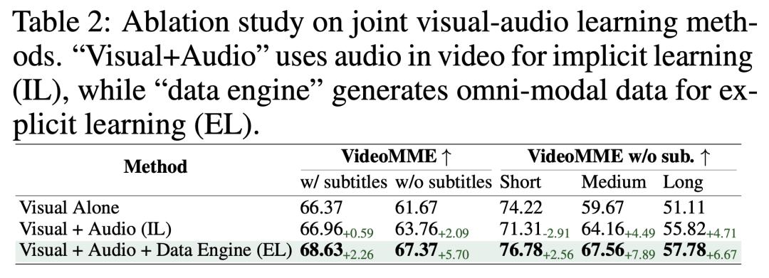 具体来说,从单纯依赖视觉,到结合音频进行隐式多模态学习,再到引入全模态数据引擎实现显式融合,模型的表现呈阶梯式跃升。