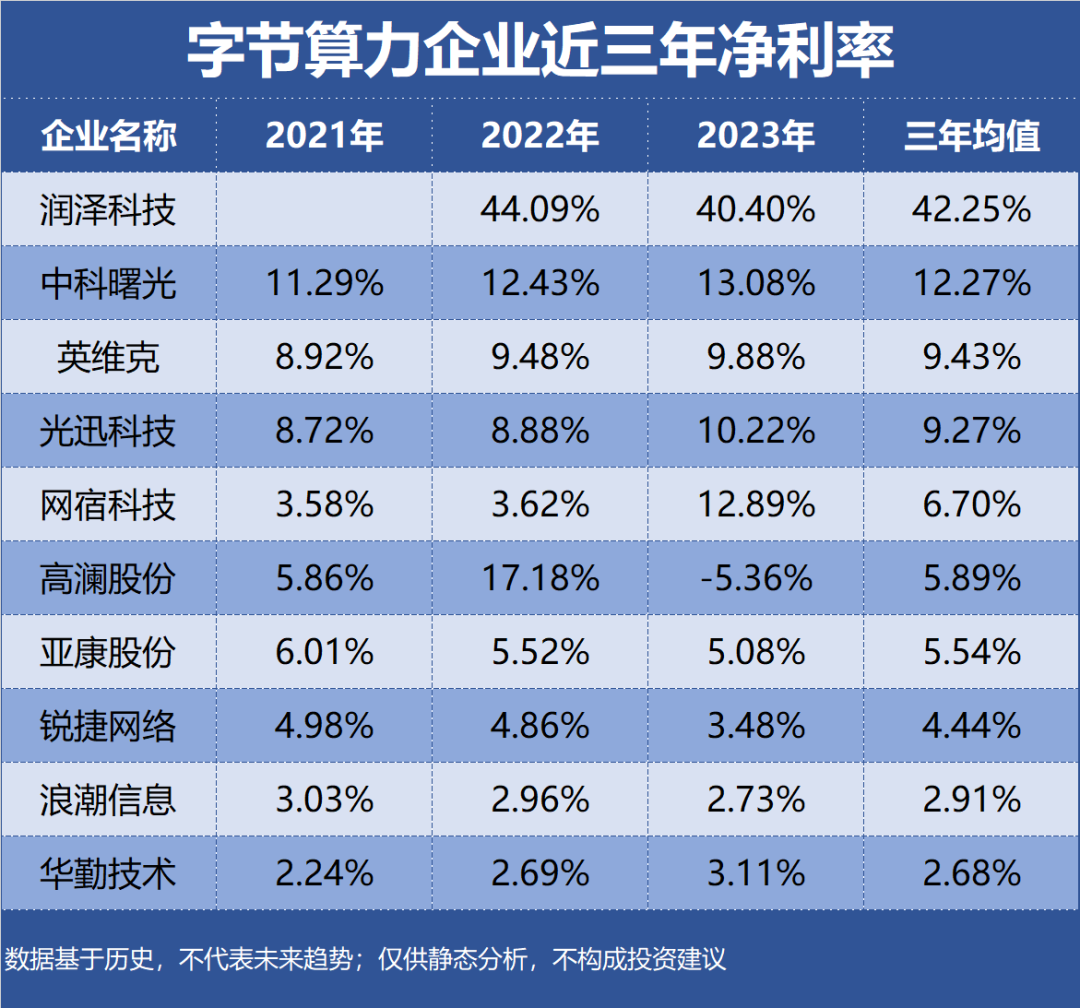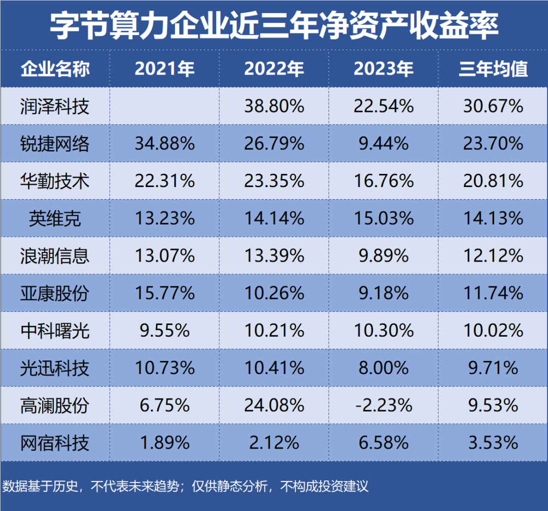 字节跳动不仅在AI算力硬件上进行大规模投资,还在算力产业链的多个环节进行布局,包括AIDC(人工智能数据中心)、交换机、光模块、液冷等,以构建自主可控的基础设施。盈利能力通常表现为一定时期内企业收益数额的多少及其水平的高低。盈利能力的分析,就是对公司利润率的深层次分析。本文为企业价值系列之【盈利能力】篇,共选取13家字节算力企业作为研究样本,并以净资产收益率、毛利率、净利率等为评价指标。数据基于历史,不代表未来趋势;仅供静态分析,不构成投资建议。