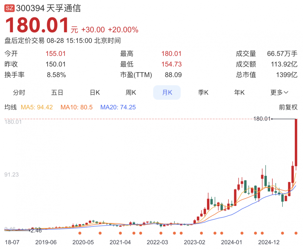 天孚通信上半年实现营收24.56亿元,同比增长57.84%;归属于上市公司股东的净利润8.99亿元,同比增长37.46%。截止收盘,天孚通信市值高达1399亿元。