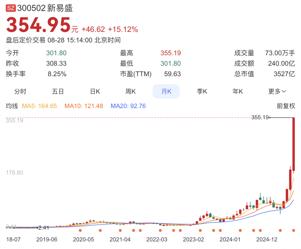 新易盛上半年实现营业收入为104.37亿元,同比增长282.64%;归属于上市公司股东的净利润39.42亿元,同比增长355.68%。截止收盘,新易盛市值高达3527亿元!
