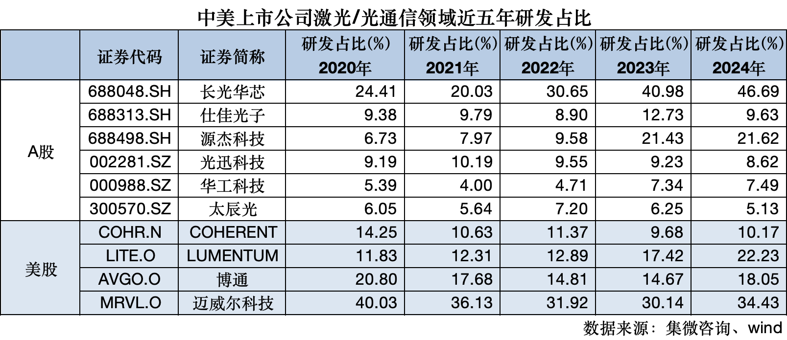 美股上市公司主要包括Coherent、Lumentum、博通、迈威尔科技等,从研发费用占比来看: