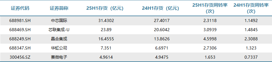 多数晶圆代工企业存货金额增长,但存货周转率普遍提升。2025年上半年半导体行业回暖,汽车电子、物联网、消费电子等下游需求爆发,企业产品订单增加、销售更旺盛,存货快速转化为收入,推动存货周转率提升;同时,为应对增长的需求,企业提前备货,导致存货金额同步增加。
